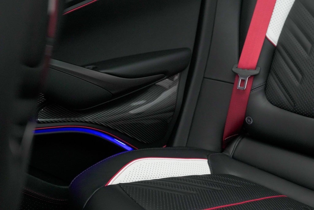 Inside, the cabin is a showcase of handcrafted luxury. Semi aniline leather in Onyx Black and Glacier White surrounds every surface, complemented by piano black and carbon fiber detailing, satin chrome jewelry, and refined contrast stitching. Heated and ventilated seating for both front and rear passengers delivers exceptional comfort, while ambient lighting and meticulous craftsmanship create a serene yet performance focused environment.