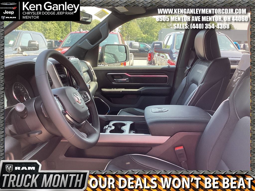 *Heated steering wheel, *ParkView Rear Back-Up Camera, *Ventilated front seats, 10 Speakers, 3.55 Rear Axle Ratio, 4-Wheel Disc Brakes, 4G LTE Wi-Fi Hot Spot, ABS brakes, Accent Color Premium Power Mirrors, Active Noise Control System, Adjustable pedals, Air Conditioning, Alloy wheels, AM/FM radio: SiriusXM with 360L, Apple CarPlay/Android Auto, Audio memory, Auto High-beam Headlights, Auto Power-Folding Mirrors, Auto-dimming door mirrors, Auto-Dimming Exterior Driver Mirror, Auto-dimming Rear-View mirror, Automatic temperature control, Black Interior Accents, Black Painted Exterior Mirrors Caps, Body Color Front Bumper, Body Color Rear Bumper with Step Pads, Brake assist, Bridgestone Brand Tires, Bumpers: chrome, Chrome Exterior Mirrors, Compass, Connected Travel and Traffic Services, Connectivity - US/Canada, Convex Wide-Angle Exterior Mirror Insert, Delay-off headlights, Dome Dual LED Reading Lamp, Driver door bin, Driver vanity mirror, Dual front impact airbags, Dual front side impact airbags, Dual-Pane Panoramic Sunroof, Electronic Stability Control, Exterior Mirrors Courtesy Lamps, Exterior Mirrors with Heating Element, Exterior Mirrors with Memory, Exterior Mirrors with Supplemental Signals, Front anti-roll bar, Front Bucket Seats, Front Center Armrest w/Storage, Front dual zone A/C, Front fog lights, Front License Plate Bracket, Front reading lights, Front wheel independent suspension, Fully automatic headlights, Garage door transmitter, GPS Navigation, Grille Surround 3 Body Color Tex 2 Black, Heated door mirrors, Heated front seats, Heated rear seats, Illuminated entry, Integrated Center Stack Radio, Integrated Voice Command with Bluetooth®, Laramie Level 1 Equipment Group, Leather steering wheel, Leather Trimmed Bucket Seats, LED Dome/Reading Lamp, Low tire pressure warning, Manufacturer's Statement of Origin, Memory seat, MOPAR Front and Rear Rubber Floor Mats, MyFlexCare Service Plan, Navigation System, Occupant sensing airbag, Off-Road Information Pages, Outside temperature display, Overhead airbag, Overhead console, Panic alarm, Passenger door bin, Passenger vanity mirror, Pedal memory, Power door mirrors, Power driver seat, Power passenger seat, Power steering, Power windows, Quick Order Package 21H Laramie, Radio data system, Radio: Uconnect 5 Navigation with 12.0 Display, Rain Sensitive Windshield Wipers, RAM Grille Badge - Chrome, Rear anti-roll bar, Rear reading lights, Rear seat center armrest, Rear step bumper, Rear Wheelhouse Liners, Remote keyless entry, Remote Tailgate Release, Security system, SiriusXM Radio Service, SiriusXM with 360L, Speed control, Split folding rear seat, Sport Appearance Package, Sport Performance Hood, Steering wheel mounted audio controls, Tachometer, Telescoping steering wheel, Tilt steering wheel, Traction control, Trailer Brake Control, Trip computer, Turn signal indicator mirrors, USB Host Flip, Variably intermittent wipers, Voltmeter, Wheels: 20 x 9 Premium Paint/Polish. PRICING AVAILABLE TO ALL CUSTOMER!!! WE ARE ONE OF OHIO'S LEADING VOLUME DEALERSHIPS COME SEE OUR HUGE SELECTION AND UNMATCHED SAVINGS ONLY AT GANLEY VILLAGE CHRYSLER DODGE JEEP RAM FIAT OF PAINESVILLE, OH 44077.