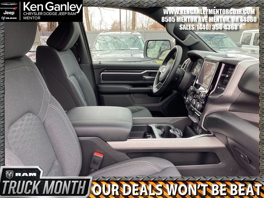 *ParkView Rear Back-Up Camera, 3 Rear Seat Head Restraints, 3.21 Rear Axle Ratio, 4 Way Front Headrests, 4-Wheel Disc Brakes, 48V Belt Starter Generator, 4G LTE Wi-Fi Hot Spot, 6 Speakers, ABS brakes, Air Conditioning, Alloy wheels, AM/FM radio, Apple CarPlay, Apple CarPlay/Android Auto, Auto High-beam Headlights, Black Exterior Mirrors, Brake assist, Bucket Seats, Bumpers: chrome, Center Console Parts Module, Cloth Bucket Seats, Compass, Connectivity - US/Canada, Convex Wide-Angle Exterior Mirror Insert, Delay-off headlights, Driver door bin, Dual front impact airbags, Dual front side impact airbags, Electronic Stability Control, Exterior Mirrors with Heating Element, Front anti-roll bar, Front Bucket Seats, Front Center Armrest w/Storage, Front fog lights, Front License Plate Bracket, Front reading lights, Front wheel independent suspension, Full Length Floor Console, Fully automatic headlights, Global Telematics Box Module, Google Android Auto, GPS Antenna Input, Heated door mirrors, Illuminated entry, Integrated Center Stack Radio, Integrated Voice Command with Bluetooth®, Low tire pressure warning, Manual Adjust 4-Way Driver Seat, Manual Adjust 4-Way Front Passenger Seat, Manual Folding Exterior Mirrors, Manufacturer's Statement of Origin, MOPAR Front and Rear Rubber Floor Mats, MyFlexCare Service Plan, Occupant sensing airbag, Outside temperature display, Overhead airbag, Overhead console, Panic alarm, Passenger door bin, Passenger vanity mirror, Power door mirrors, Power steering, Power windows, Quick Order Package 23Z Big Horn, Radio data system, Radio: Uconnect 5 W with 8.4 Display, RAM Grille Badge - Chrome, Rear anti-roll bar, Rear step bumper, Remote keyless entry, Speed control, Supplier Part Tracking (J-1), Tachometer, Telescoping steering wheel, Tilt steering wheel, Traction control, Trip computer, USB Host Flip, Variably intermittent wipers, Voltmeter, Wheels: 18 x 8 Cast-Aluminum Painted. PRICING AVAILABLE TO ALL CUSTOMER!!! WE ARE ONE OF OHIO'S LEADING VOLUME DEALERSHIPS COME SEE OUR HUGE SELECTION AND UNMATCHED SAVINGS ONLY AT GANLEY VILLAGE CHRYSLER DODGE JEEP RAM FIAT OF PAINESVILLE, OH 44077.