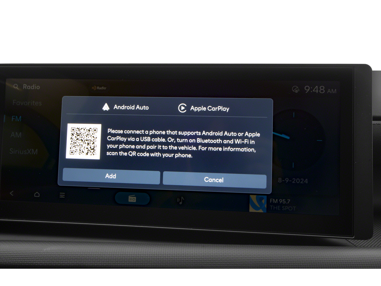 - Radio: AM/FM/HD Audio System -inc: 12.3" color touchscreen display, 6 speakers, SiriusXM satellite radio system (3-month trial subscription), wireless Apple CarPlay and Android Auto integration, controller OTA update capability, Blue Link connected car system and USB connectivity