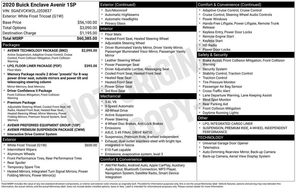 Buick Enclave Avenir 2020 White Frost Tricoat Newly Detailed, AWD, 10 Speakers, 120-Volt Power Outlet, 1st & 2nd Row All-Weather Floor Liners (LPO), 3.49 Axle Ratio, 3rd Row 60/40 Power Fold Split-Bench, 3rd Row All-Weather Floor Liner (LPO), 3rd row seats: split-bench, 4-Wheel Disc Brakes, 7-Passenger Seating, ABS brakes, Advanced Adaptive Cruise Control, Air Conditioning, Alloy wheels, AM/FM radio: SiriusXM with 360L, Apple CarPlay/Android Auto, Audio memory, Auto High-beam Headlights, Auto tilt-away steering wheel, Auto-dimming door mirrors, Auto-dimming Rear-View mirror, Automatic Heated Steering Wheel, Automatic temperature control, Avenir Package, Avenir Premium Suspension Package, Avenir Technology Package, Bose Performance-Enhanced 10-Speaker System, Brake assist, Bumpers: body-color, Chassis Continuously Variable Real Time Damping, Compass, Delay-off headlights, Driver 4-Way Power Lumbar Seat Adjuster, Driver door bin, Driver vanity mirror, Dual front impact airbags, Dual front side impact airbags, Electronic Stability Control, Emergency communication system: OnStar and Buick connected services capable, Enhanced Automatic Emergency Braking, Floor Liner Package (LPO), Four wheel independent suspension, Front anti-roll bar, Front Bucket Seats, Front Center Armrest, Front dual zone A/C, Front Passenger 4-Way Power Lumbar Seat Adjuster, Front Power Sliding Moonroof, Front reading lights, Fully automatic headlights, Garage door transmitter, HD Radio, HD Surround Vision, Heated 2nd Row Outboard Seats, Heated door mirrors, Heated Driver & Front Passenger Seats, Heated front seats, Heated rear seats, Heated steering wheel, Illuminated entry, Inside Rearview Mirror w/Full Camera Display, Integrated Cargo Liner (LPO), Leather steering wheel, Low tire pressure warning, Memory Package, Memory seat, Navigation System, Occupant sensing airbag, Outside Heated Power-Adjustable Mirrors, Outside temperature display, Overhead airbag, Overhead console, Panic alarm, Passenger door bin, Passenger vanity mirror, Perforated Leather-Appointed Seat Trim, Power door mirrors, Power driver seat, Power Liftgate, Power moonroof, Power passenger seat, Power steering, Power Tilt & Telescopic Steering Column, Power windows, Preferred Equipment Group 1SP, Premium audio system: Buick Infotainment System, Premium Ride Suspension, Radio data system, Radio: Buick Infotainment Sys AM/FM Stereo w/Nav, Rear air conditioning, Rear anti-roll bar, Rear reading lights, Rear window defroster, Rear window wiper, Remote keyless entry, Roof rack: rails only, Security system, SiriusXM w/360L, Speed control, Speed-sensing steering, Spoiler, Steering wheel memory, Steering wheel mounted audio controls, Tachometer, Telescoping steering wheel, Tilt steering wheel, Traction control, Trip computer, Turn signal indicator mirrors, Variably intermittent wipers, Ventilated Driver & Front Passenger Seats, Ventilated front seats, Voltmeter, Wheels & Front Door Badging, Wheels: 20 Aluminum w/Premium Pearl Nickel Finish, Wireless Charging, AWD. Priced below KBB Fair Purchase Price!