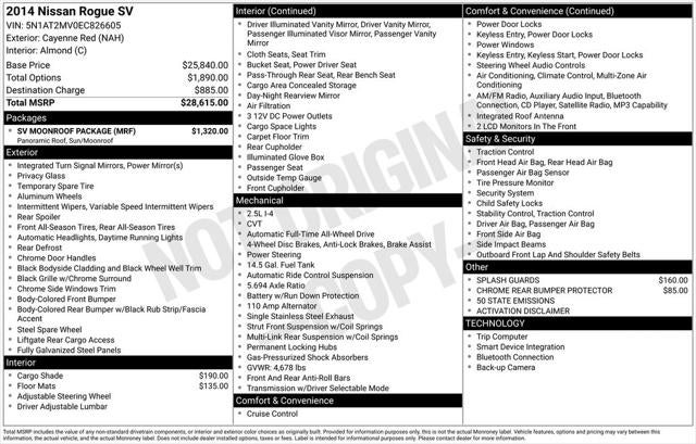 Priced below KBB Fair Purchase Price! 2014 Cayenne Red Nissan Rogue SV 2.5L I4 DOHC 16V AWD This Nissan Rogue has many features and is well equipped including, Power Panoramic Moonroof, SV Moonroof Package.