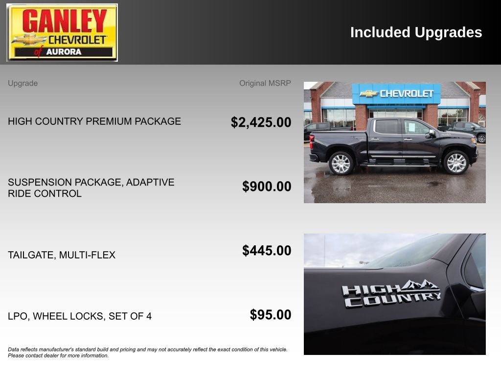 2023 Dark Ash Metallic Chevrolet Silverado 1500 High Country Silverado 1500 High Country, 4D Crew Cab, EcoTec3 5.3L V8, 10-Speed Automatic, 4WD, Dark Ash Metallic, Jet Black/Nightshift Blue Leather, 10-Way Power Driver Seat w/Lumbar, 10-Way Power Passenger Seat Adjuster w/Lumbar, 12.3 Multicolor Reconfigurable Digital Display, 120-Volt Bed Mounted Power Outlet, 120-Volt Instrument Panel Power Outlet, 2 USB Data Ports, 2nd Row Heated Outboard Seats, All-Weather Floor Liner (LPO), Android Auto, Apple CarPlay, Auto-Dimming Inside Rear-View Mirror, Auto-Locking Rear Differential, Backup Camera, Bed View Camera, Bluetooth® Hands-Free, Bluetooth® For Phone, Body-Color Painted Mirror Caps, Chevrolet Connected Access Capable, Chevytec Spray-On Black Bedliner, Chrome Assist Steps, Chrome Recovery Hooks, Color-Keyed Carpeting Floor Covering, Compass, Deep-Tinted Glass, Driver Memory, Dual Exhaust w/Polished Outlets, Dual Rear USB Ports (Charge Only), Electric Rear-Window Defogger, Electrical Steering Column Lock, Electronic Cruise Control, Floor Mounted Center Console, Front Carpeted Floor Mats, Front LED Fog Lamps, Front Rainsensing Wipers, HD Surround Vision, Heated Driver & Front Outboard Passenger Seats, Heated Steering Wheel, High Capacity Suspension Package, High Country Premium Package, Hitch Guidance, Hitch Guidance w/Hitch View, Integrated Trailer Brake Controller, Keyless Open & Start, LED Cargo Area Lighting, OnStar & Chevrolet Connected Services Capable, Outside Heated Power-Adjustable Mirrors, Perimeter Lighting, Power Front Passenger Windows w/Express Up/Down, Power Front Windows w/Driver Express Up/Down, Power Rear Windows w/Express Down, Power Sliding Rear Window w/Rear Defogger, Power Sunroof, Power Tailgate, Power Tilt & Telescoping Steering Column, Preferred Equipment Group 3LZ, Rear Carpeted Floor Mats, Rear Cross Traffic Alert-Braking, Rear Pedestrian Alert, Rear Wheelhouse Liners, Remote Start, Remote Vehicle Starter System, Safety Alert Seat, SiriusXM w/360L, Standard Tailgate, Steering Wheel Audio Controls, Theft Deterrent System (Unauthorized Entry), Trailer Camera Provisions, Trailer Side Blind Zone Alert, Trailering App, Trailering Package, Ultrasonic Front & Rear Park Assist, Universal Home Remote, Up-Level Rear Seat w/Storage Package, Ventilated Driver & Front Passenger Seats, Wheels: 22 x 9 Painted Aluminum, Wi-Fi Hot Spot Capable, Wireless Charging, Wireless Phone Projection, Wrapped Steering Wheel.