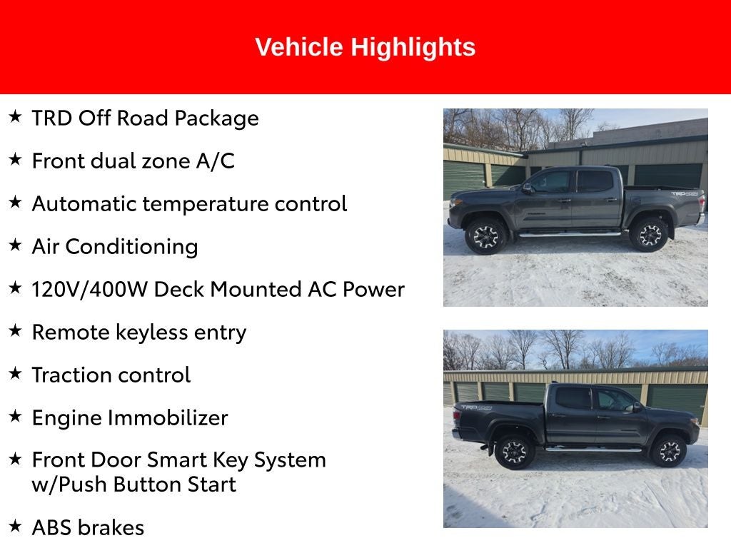 Certified. 2023 Magnetic Gray Metallic Toyota Tacoma TRD Off-Road 3.5L V6 4WD 120V/400W Deck Mounted AC Power, ABS brakes, Active Cruise Control, Air Conditioning, Alloy wheels, Automatic temperature control, Black Overfenders, Electronic Stability Control, Engine Immobilizer, Front Door Smart Key System w/Push Button Start, Front dual zone A/C, Heated door mirrors, Illuminated entry, Low tire pressure warning, Power Sliding Rear Window w/Privacy Glass, Remote keyless entry, Traction control, TRD Off Road Package.