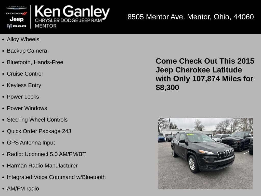 Alloy Wheels, Backup Camera, Bluetooth®, Hands-Free, Cruise Control, Keyless Entry, Power Locks, Power Windows, Steering Wheel Controls, Cherokee Latitude, 4D Sport Utility, 2.4L 4-Cylinder SMPI SOHC, 9-Speed 948TE Automatic, 4WD, Brilliant Black Crystal Pearlcoat, Black w/Cloth Low-Back Bucket Seats, *ParkView Rear Back-Up Camera, 17 x 7 Aluminum Wheels, 3.73 Axle Ratio, 4-Wheel Disc Brakes, 6 Speakers, ABS brakes, Active Grille Shutters, Air Conditioning, Alloy wheels, AM/FM radio, Anti-whiplash front head restraints, Auxiliary Transmission Oil Cooler, Brake assist, Bumpers: body-color, Compass, Delay-off headlights, Driver door bin, Driver vanity mirror, Dual front impact airbags, Dual front side impact airbags, Electronic Stability Control, Engine Oil Cooler, Four wheel independent suspension, Front anti-roll bar, Front Bucket Seats, Front Center Armrest, Front fog lights, Front reading lights, Fully automatic headlights, GPS Antenna Input, Harman Radio Manufacturer, Illuminated entry, Integrated Voice Command w/Bluetooth®, Knee airbag, Low tire pressure warning, Manufacturer's Statement of Origin, Normal Duty Suspension, Occupant sensing airbag, Outside temperature display, Overhead airbag, Overhead console, Panic alarm, Passenger door bin, Passenger vanity mirror, Power door mirrors, Power steering, Power windows, Premium Cloth Bucket Seats, Quick Order Package 24J, Radio data system, Radio: Uconnect 5.0 AM/FM/BT, Rear anti-roll bar, Rear reading lights, Rear seat center armrest, Rear side impact airbag, Rear window defroster, Rear window wiper, Remote keyless entry, Roof rack: rails only, Speed control, Speed-sensing steering, Split folding rear seat, Spoiler, Steering wheel mounted audio controls, Tachometer, Telescoping steering wheel, Tilt steering wheel, Traction control, Trip computer, Variably intermittent wipers, Voltmeter, Cherokee Latitude, 4D Sport Utility, 2.4L 4-Cylinder SMPI SOHC, 9-Speed 948TE Automatic, 4WD, Brilliant Black Crystal Pearlcoat, Black w/Cloth Low-Back Bucket Seats, *ParkView Rear Back-Up Camera, 17 x 7 Aluminum Wheels, 3.73 Axle Ratio, 4-Wheel Disc Brakes, 6 Speakers, ABS brakes, Active Grille Shutters, Air Conditioning, Alloy wheels, AM/FM radio, Anti-whiplash front head restraints, Auxiliary Transmission Oil Cooler, Brake assist, Bumpers: body-color, Compass, Delay-off headlights, Driver door bin, Driver vanity mirror, Dual front impact airbags, Dual front side impact airbags, Electronic Stability Control, Engine Oil Cooler, Four wheel independent suspension, Front anti-roll bar, Front Bucket Seats, Front Center Armrest, Front fog lights, Front reading lights, Fully automatic headlights, GPS Antenna Input, Harman Radio Manufacturer, Illuminated entry, Integrated Voice Command w/Bluetooth®, Knee airbag, Low tire pressure warning, Manufacturer's Statement of Origin, Normal Duty Suspension, Occupant sensing airbag, Outside temperature display, Overhead airbag, Overhead console, Panic alarm, Passenger door bin, Passenger vanity mirror, Power door mirrors, Power steering, Power windows, Premium Cloth Bucket Seats, Quick Order Package 24J, Radio data system, Radio: Uconnect 5.0 AM/FM/BT, Rear anti-roll bar, Rear reading lights, Rear seat center armrest, Rear side impact airbag, Rear window defroster, Rear window wiper, Remote keyless entry, Roof rack: rails only, Speed control, Speed-sensing steering, Split folding rear seat, Spoiler, Steering wheel mounted audio controls, Tachometer, Telescoping steering wheel, Tilt steering wheel, Traction control, Trip computer, Variably intermittent wipers, Voltmeter. Jeep Cherokee 2015 Brilliant Black Crystal Pearlcoat Latitude