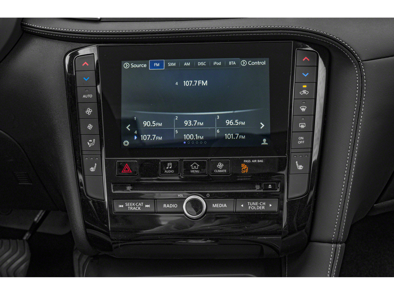 16 Speakers, 4-Wheel Disc Brakes, 5.846 Axle Ratio, ABS brakes, Air Conditioning, AM/FM radio: SiriusXM, Anti-whiplash front head restraints, Auto High-beam Headlights, Auto-dimming Rear-View mirror, Automatic temperature control, Black Splash Guards (Set of 4), Brake assist, Bumpers: body-color, Cargo Package, CD player, Climate Controlled Front Bucket Seats, Delay-off headlights, Driver door bin, Driver vanity mirror, Dual front impact airbags, Dual front side impact airbags, Electronic Stability Control, Emergency communication system: INFINITI InTouch, Floor Mats, Four wheel independent suspension, Front anti-roll bar, Front Bucket Seats, Front Center Armrest, Front dual zone A/C, Front fog lights, Front reading lights, Fully automatic headlights, Garage door transmitter: HomeLink, Heated door mirrors, Heated front seats, Heated steering wheel, Illuminated entry, Illuminated Kick Plates, Knee airbag, Leather Shift Knob, Leather-Appointed Seat Trim, Low tire pressure warning, Memory seat, Navigation system: INFINITI InTouch Navigation, Occupant sensing airbag, Outside temperature display, Overhead airbag, Overhead console, Panic alarm, Passenger door bin, Passenger vanity mirror, Power door mirrors, Power driver seat, Power Liftgate, Power moonroof, Power passenger seat, Power steering, Power windows, Radio data system, Radio: Bose Performance Series Audio System, Rain sensing wipers, Rear anti-roll bar, Rear reading lights, Rear seat center armrest, Rear side impact airbag, Rear window defroster, Rear window wiper, Remote keyless entry, Security system, Speed control, Speed-sensing steering, Speed-Sensitive Wipers, Split folding rear seat, Spoiler, Steering wheel mounted audio controls, Tachometer, Telescoping steering wheel, Tilt steering wheel, Traction control, Trip computer, Turn signal indicator mirrors, Variably intermittent wipers, Ventilated front seats.